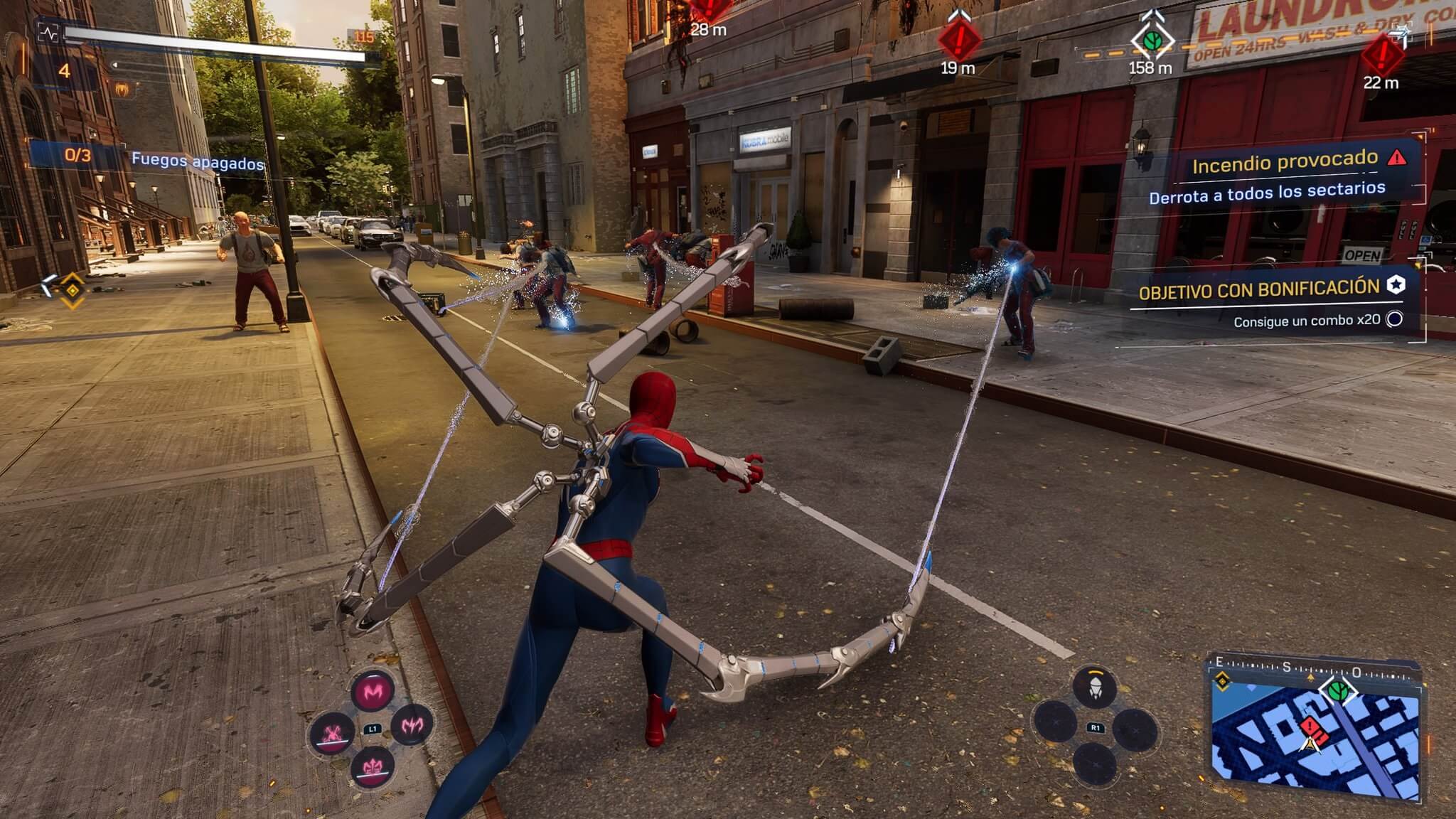 Además de los artilugios tendremos las técnicas especiales, que en este caso se activarán con L1 y los cuatro botones principales. Serán unos movimientos más fuertes, contundentes o con daño de área, que no se limitarán a ser solo cuatro ya que durante la trama desbloquearemos nuevos que equipar como reemplazo y mejorar desde el árbol de habilidades de cada personaje, teniendo Miles unos y Peter otros diferentes sintiendo que el combate tiene algunas diferencias al controlar a uno u otro.