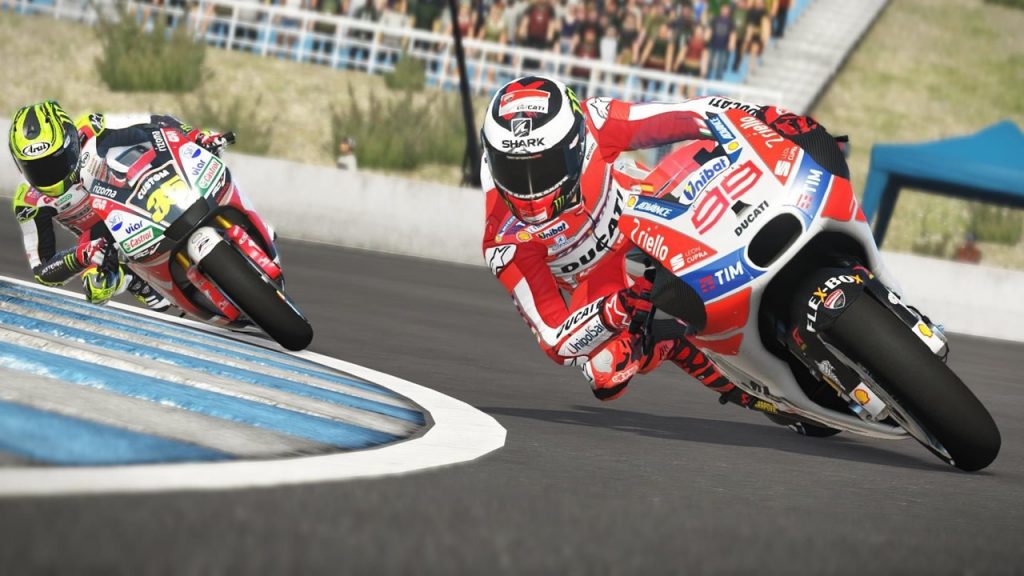Las cifras, que es algo que gusta conocer a todo el que está interesado en un juego de este tipo, no son las más altas de la simulación automovilística, pero tampoco se quedan cortas. 18 circuitos reales y oficiales, con distintos trazados para según qué pruebas, y unas 50 motos entre los modelos de las Leyendas y los actuales, pistas y vehículos con bastante nivel de detalle y cartelería a la orden del día, como es natural. En las configuraciones de cámara o momento del día y clima, encontramos exactamente lo que el año pasado, siendo la cámara con vista en primera persona la que mejor sensación de precisión en el control ofrece, y de nuevo bajo sol, nublado, lluvia, noche… Pero sin clima dinámico en carrrera y no excesivamente notable en comportamiento de neumáticos o visibilidad. Quizá ahí, donde está, está bien, ya que otros simuladores se empeñan en recrear las superficies resbaladizas y acaban por exagerar la humedad o los deslumbres del sol de frente.
