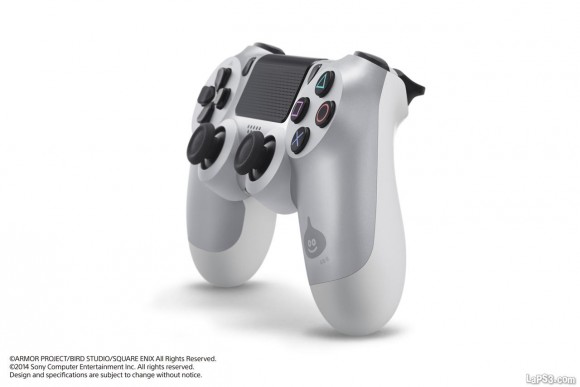 Y otro que juega con un diseño similar es este DualShock 4 de Dragon Quest Heroes que tiene a los Slimes metálicos como protagonistas, igual que ocurre con la consola que viene junto al juego en su pack y esa llamativa figura que parece mercurio derretido. Aquí la apuesta es mucho más diáfana y suave, con un blanco muy claro en las curvas de las empuñaduras y el anagrama del mítico personajillo de la serie de Square Enix en el agarre izquierdo sobre las tímidas iniciales SE de la compañía. Muy limpio.