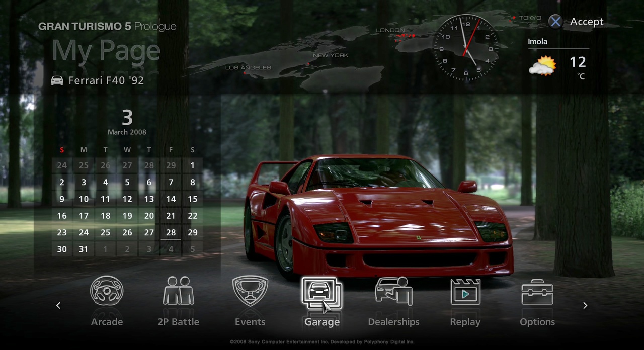 Llevar el lastre de “The Real Driving Simulator” es una carga pesada, pues se espera mucho de él, es más, se espera que sea el simulador definitivo, el “orgasmatrón" de los aficionados al motor. Y si se va azuzando con expectativas por parte de su distribuidora y su desarrolladora, junto con montones de imágenes alucinantes (ninguna de ellas in-game, por cierto) más si cabe. Recordemos que ya vimos un par de circuitos, uno en GT5 HD con sus tantos coches y solo dos vistas, y otro en la demo que se lanzó en territorio oriental, con menos vehículos pero con las vistas más definitivas. Subsanados en un principio algunas de las pegas mostradas en anteriores entregas, empecemos a ver lo que trae y oferta GT5P. En primera instancia nos vamos a encontrar con un menú muy al estilo PS3, una barra horizontal en la parte baja, con todas las opciones y nuestro vehículo seleccionado en un bonito entorno dando vueltas, con un calendario, un reloj y el estado climatológico de algún circuito. La barra cuenta con tres opciones online: Noticias, GT-TV, Online y clasificación, siendo en Online donde accederemos para jugar, y las otras dos relativas a acontecimientos GT5 y vídeos; Clasificación nos mostrará el ranking mundial.