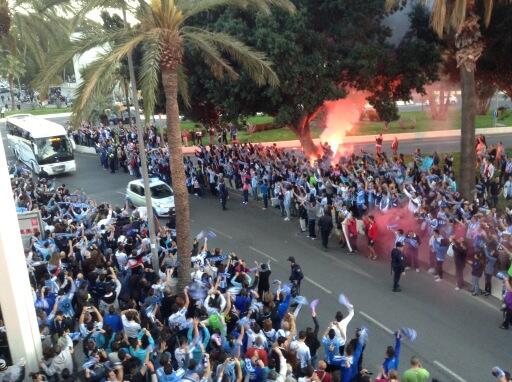 El primero, es el recibimiento al autobus del Málaga al llegar el estadio, después de caer eliminados en Champions, miles de personas: