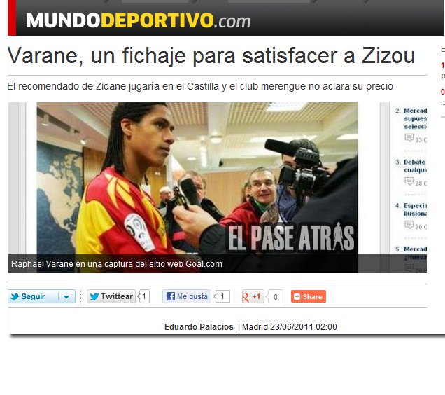 "El Madrid tiene ya 'atado' a Raphael Varane, un central de 18 años procedente del Lens, club francés que ha descendido a Segunda. Una contratación para satisfacer a Zinedine Zidane y hacerle creer que sus opiniones cuentan en el club. El presidente blanco, Florentino Pérez, quiere contentar así al héroe de la 'Novena' con un fichaje 'político'. El recomendado de Zizou vendría para jugar con el Castilla, en Segunda B, y se le haría ficha del filial.