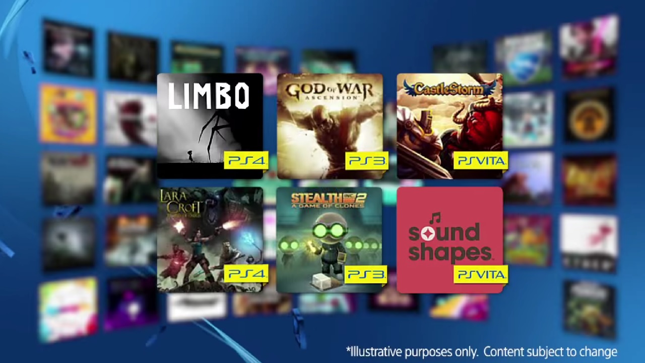 De esta manera, los jugadores de PS4 se podrán hacer con Lara Croft y el Templo de Osiris y Limbo. Los usuarios que tengan una PS3 se podrán descargar de manera gratuita los títulos God of War: Ascension y Stealth Inc 2: A Game of Clones. Por último, los jugadores de PS Vita tendrán la ocasión de hacerse con Sound Shapes y CastleStorm Complete Edition. Debido a sus funciones cross-buy, Stealth Inc 2 también se podrá descargar en PS3 y PS Vita, así como Sound Shapes en PS4. CastleStorm también se podrá adquirir para PS3.