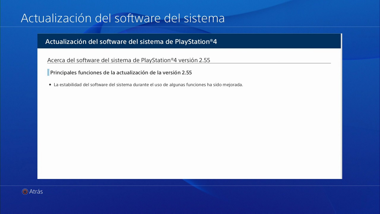 Tal y como podéis ver en la imagen que ilustra esta información, la actualización 2.55 de PlayStation 4 mejora la estabilidad del software del sistema durante el uso de algunas funcionas. Es decir, la actualización 2.55 de la consola de Sony no es de gran importancia, aunque su descarga debe realizarse de manera obligatoria para seguir disfrutando de todas las posibilidades de la máquina.