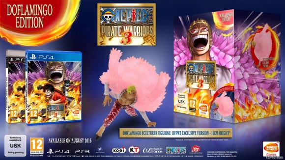 La mencionada Edición Doflamingo de One Piece: Pirate Warriors 3 ofrecerá, junto con el propio juego, una figura de Doflamingo de 16cm de altura que hará las delicias de los coleccionistas. En lo que respecta a los incentivos de reserva, estos consistirán en dos contenidos descargables (dos trajes y dos misiones), así como una caja metálica exclusiva.