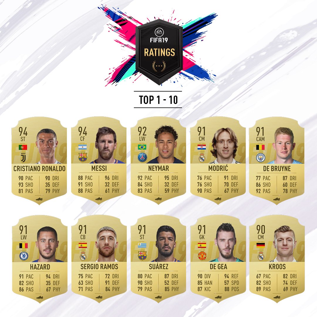 Se ha disipado una de las incógnitas más esperadas e importantes para todos los aficionados de la franquicia FIFA, las valoraciones, estadísticas o ratings de los 100 mejores jugadores de la próxima entrega de la serie, FIFA 19, la cual estará disponible a finales de este mes. Como era de esperarse, la lista sigue siendo encabezada por los dos mejores futbolistas de este siglo, Cristiano Ronaldo y Lionel Messi, quienes contarán con los mismos puntos de valoración en esta edición.
