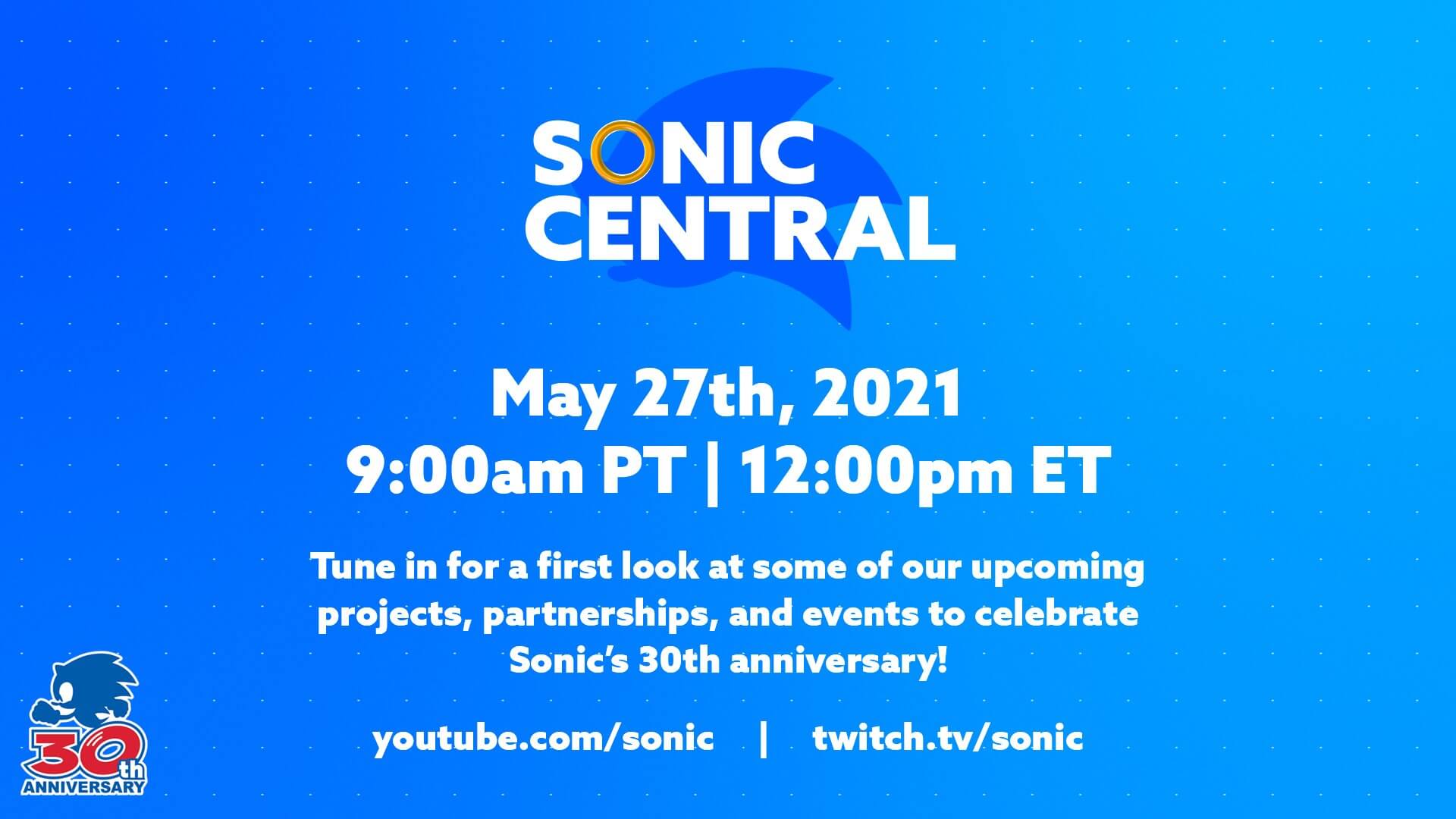 La transmisión iniciará a las 18:00 (hora peninsular) y podrás seguirla en directo desde esta noticia o desde el canal de Twitch de SEGA. Puedes estar atento al hashtag #Sonic30th en Twitter para informarte de todo lo que comparten los fans.