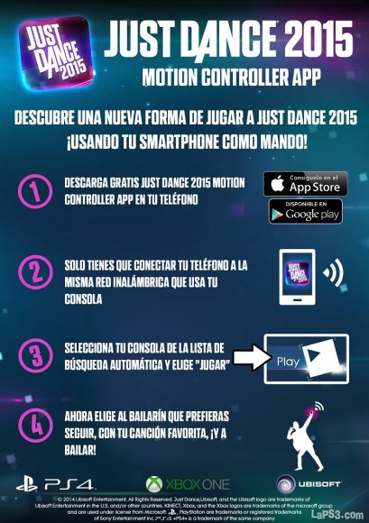 Ubisoft nos recuerda, mediante nota de prensa, que ya esta disponible para su descarga Just Dance 2015 Motion Controller App. Esta aplicación nos permite disfrutar de la última entrega de la franquicia en PS4 sin necesidad de tener PlayStation Camera o PlayStation Move gracias a nuestro smarpthone.