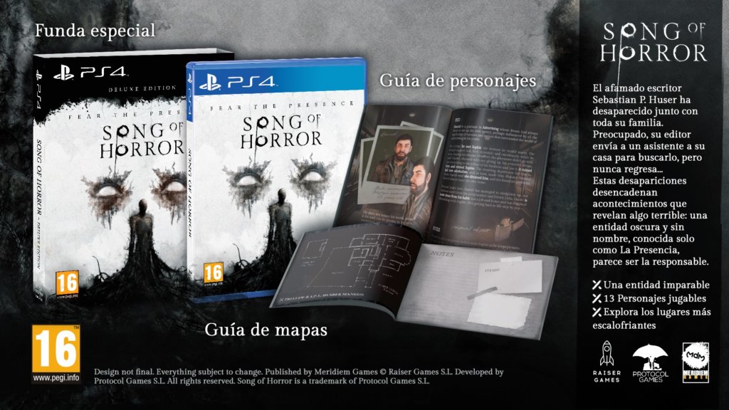 La edición física Deluxe de Song of Horror incluye una funda especial con una ilustración de La Presencia, entidad misteriosa que complicará la existencia del jugador durante todo su periplo. Además, tiene una guía de mapas con pistas y ayudas; y otra guía de personajes para conocer toda la historia de los 13 protagonistas jugables de la aventura.
