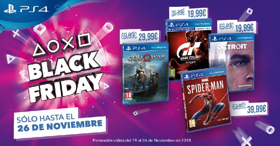 Por otra parte, la campaña de Black Friday de PlayStation también contará desde hoy con suculentos descuentos (activos desde hoy hasta el próximo 26 de noviembre de 2018) en la edición física de muchos de los grandes videojuegos exclusivos de PS4. De esta forma, los jugadores podrán adquirir títulos como Marvel’s Spider-Man, el deslumbrante videojuego de acción de uno de los súper héroes más queridos, por un precio recomendando 39,99 €; vivir las aventuras del icónico guerrero Kratos en un mundo de mitología nórdica en God of War, que estará disponible por un precio recomendando de 29,99 €; pilotar los mejores bólidos con Gran Turismo Sport, disponible a un precio recomendado de 19,99 €; o adentrarse en el futuro distópico que propone Detroit: Become Human, que podrá adquirirse a un precio recomendado de 19,99 €.