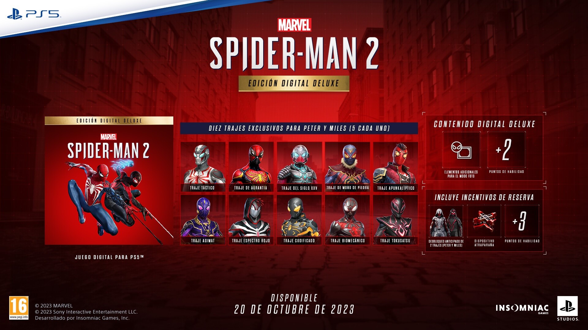 Ahora, la compañía ha desvelado los incentivos de reserva del juego. Todos los jugadores que reserven desde el 16 de junio, recibirán como recompensa el desbloqueo anticipado del Traje de Caballero Araña para Peter y del Traje de Araña Sombría para Miles (con tres colores diferentes cada uno); además del desbloqueo anticipado del Dispositivo Atraparaña y tres puntos de habilidad.