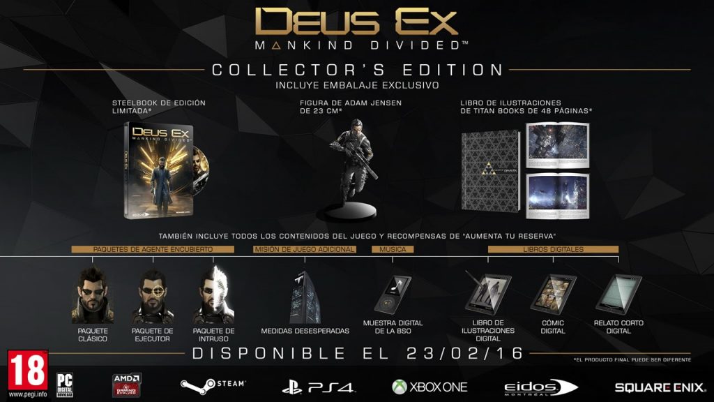 De esta forma, se ha confirmado la Day One Edition que, junto al juego, incluye: una muestra digital de la Banda Sonora Original, packs de agente encubierto, una misión extra en el juego y libros digitales. Por otra parte será posible adquirir la Edición Coleccionista de Deus Ex: Mankind Divided, que ofrecerá todo lo anterior además de un libro de ilustraciones de “Titán Books” de 48 páginas, una figura de Adam Jensen de 23 centímetros y una caja steelbook de edición limitada. Esta edición es la que podéis ver ilustrando la noticia.