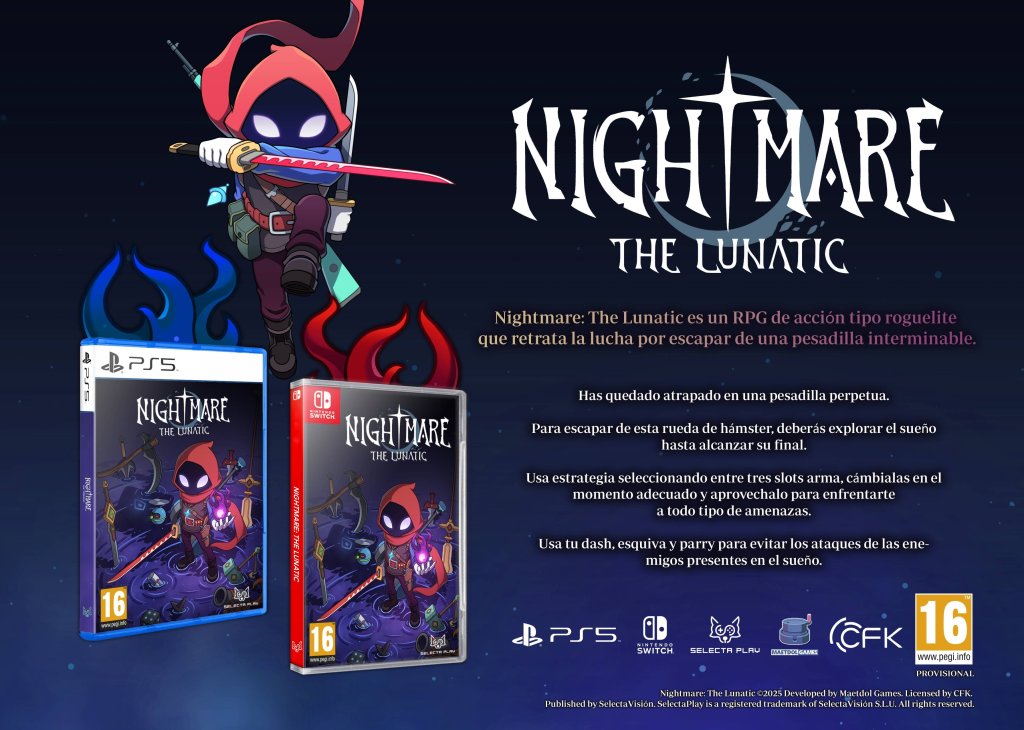 Selecta Play ha anunciado que Nightmare: The Lunatic llegará en formato físico a PS5 y Nintendo Switch, un desafiante videojuego de acción ambientado en una pesadilla sin fin para encontrar una salida y recuperar su libertad.