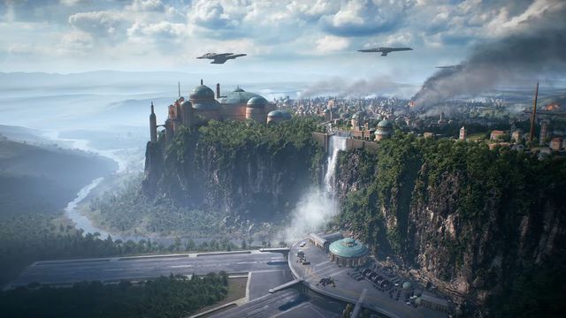 Se trata de una ciudad de un planeta ya conocido. Estamos en el planeta Naboo, donde tuvieron lugar los acontecimientos del primer capítulo de las precuelas (con un poco de suerte podremos pegarle un tiro a Jar-Jar Binks), pero ojo, lo que vemos en la imagen no es ingame. Se trata de un arte conceptual, una idea de lo que veremos en la retransmisión del viernes a las 21.00 (horario peninsular español).