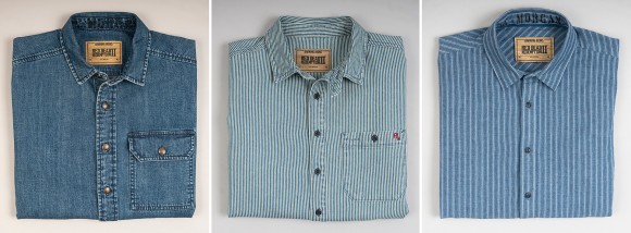 Camisa de trabajo de mezclilla: camisa de trabajo de mezclilla japonesa con lavado suave, corchetes de bronce antiguos y grabado de A. Morgan en el cuello.