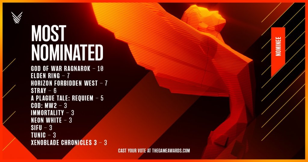 Tal y como describe el tweet anterior, God of War Ragnarok ha sido el juego más nominado de los premios con un total de 10 participaciones en categorías, seguido por Elden Ring y Horizon Forbidden West con 7 nominaciones.