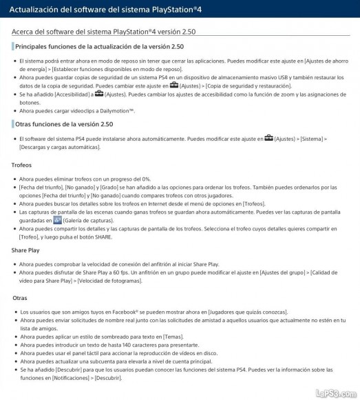 En la imagen que ilustra esta información podéis descubrir todas las novedades y ajustes que presenta la actualización 2.50 de PS4. Si queréis verla con mayor detalle no tenéis más que pinchar sobre ella para descubrir todos los extras del nuevo parche, que tiene un tamaño aproximado de 240MB.
